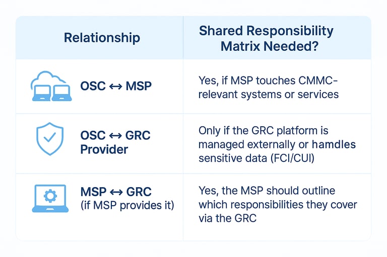 In the CMMC (Cybersecurity Maturity Model Certification) context, a Shared Responsibility Matrix (SRM) should exist between the Organization Seeking Certification (OSC) and any Managed Service Provider (MSP)—and by extension, also with any GRC platform the OSC uses if it impacts implementation or evidence collection for CMMC controls. Here’s how this typically breaks down: